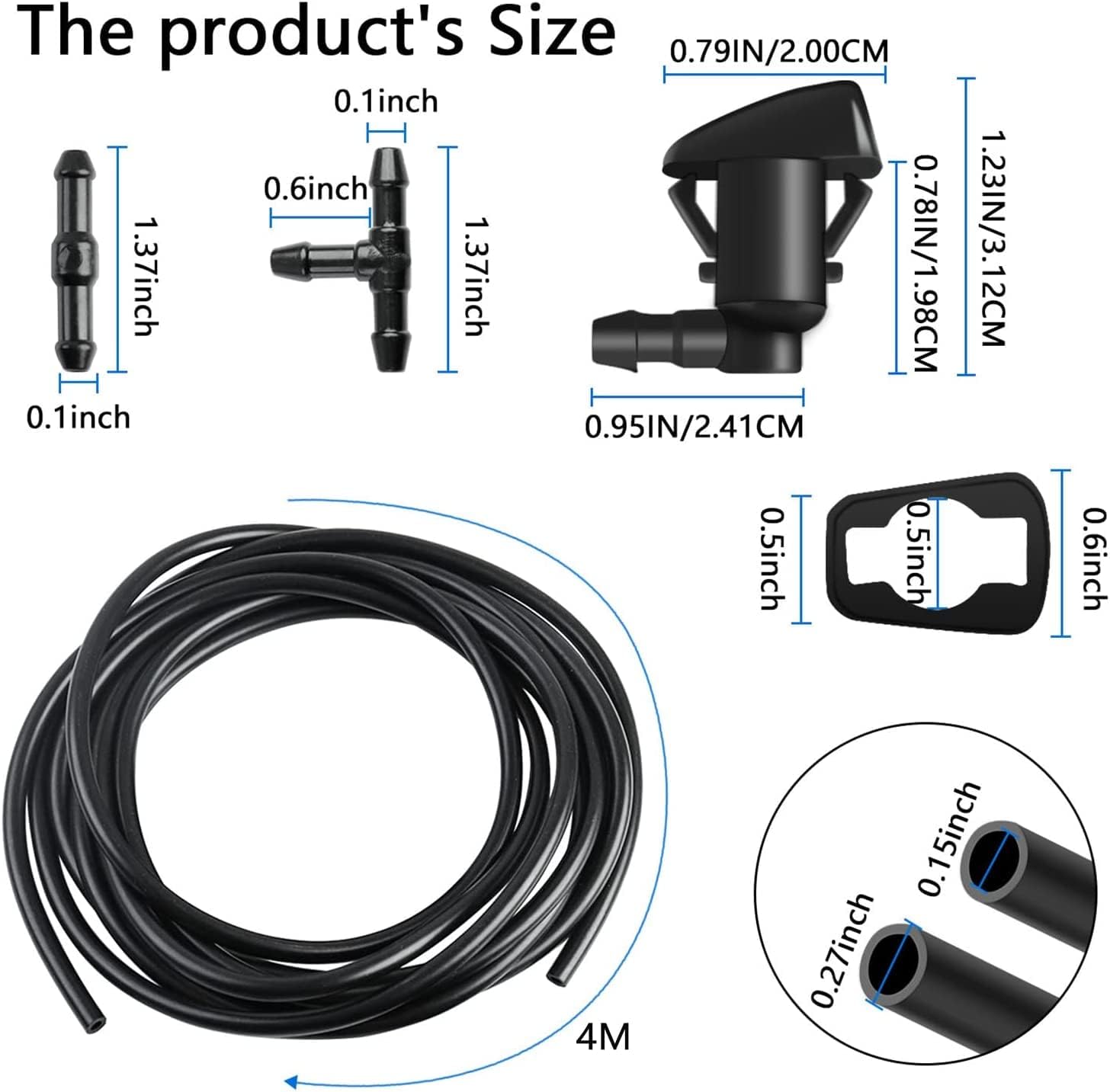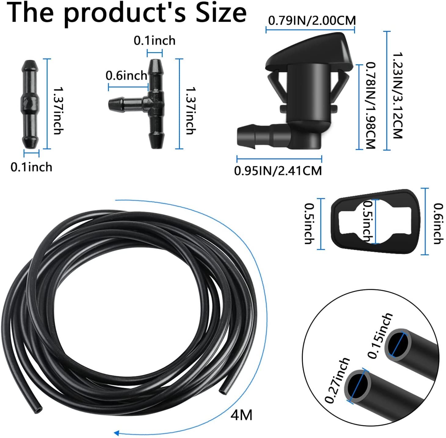 - PREMIUM QUALITY:The Windshield Washer Nozzle with hose connnector and Hood Insulation Retainers consist of premium quality plastic material, the Windshield Fluid Hose and gasket make of premium rubber material, which is strong durable, the windshield washer nozzles kit is not easy to break. The Fastener Removal Tool made of premium quality plastic and metal. Easy installation, can complete replacement in few mimutes.