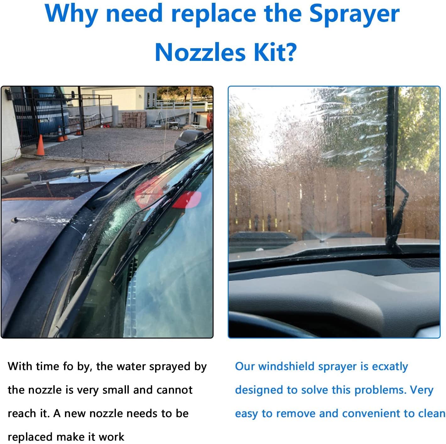 - WINDSHIELD WASHER NOZZLES REPLACEMENT:When your windshield is covered with dust, fog, falling snow or other contaminants, you need to spray water on the windshield to maintain a clear view. This nozzle kit is ecxatly designed to solve your troubles. Clean your trucl windshield, give you a more clear view;The hose conntector is designed to connect smoothly between 2 or 3 windshiled fluid hose